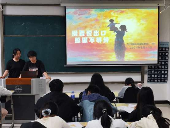 “同學(xué)們,猜一猜明天是什么節(jié)日啊?”“母親節(jié)!”5月11日,新聞傳播學(xué)類(lèi)專(zhuān)業(yè)2023(7)、(8)班在K202教室開(kāi)展以“愛(ài)要說(shuō)出口,感恩不等待”為主題的團(tuán)建活動(dòng)。活動(dòng)開(kāi)始前,活動(dòng)負(fù)責(zé)人、新聞傳播學(xué)類(lèi)專(zhuān)業(yè)2023(7)、(8)班的班長(zhǎng)楊雨霏、朱研溪提前為每位同學(xué)準(zhǔn)備好信紙和信封。朱研溪說(shuō):“我們希望通過(guò)寫(xiě)信這種傳統(tǒng)而深情的溝通方式,讓同學(xué)們勇敢表達(dá)自己的心聲,將對(duì)母親的愛(ài)訴說(shuō)于筆尖。”學(xué)生們觀看一段關(guān)于母愛(ài)的感人短片后,...